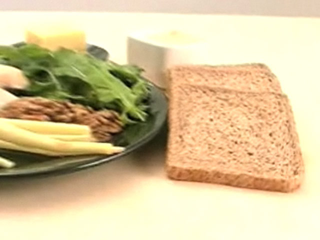 Рецепт сэндвича с рукколой и грецкими орехами.Состав:куриная грудка — 2 кусочка;сельдерей — 1 стручок;сливочное масло — 100 гр;хлеб — 4 кусочка;грецкие орехи, рукола, майонез.